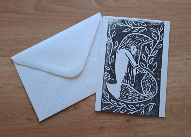 Le dessin imprimé sur la carte a été gravé à la main sur de la gomme. Le tampon réalisé, il est ensuite imprimé sur une carte, grâce à une technique similaire à la linogravure.