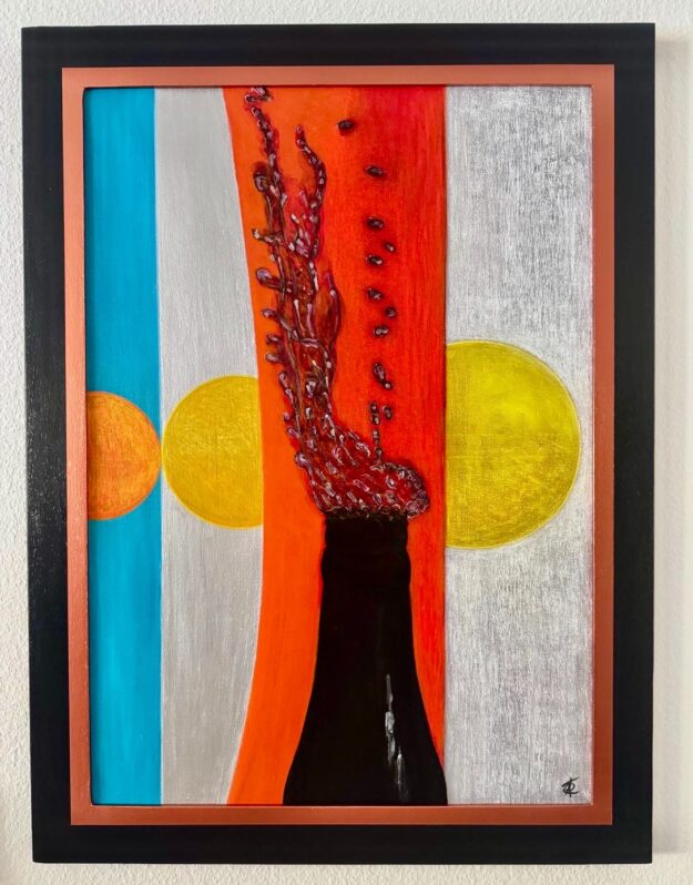 Cette œuvre sur toile, réalisée en technique mixte (acrylique et huile), mesure 70 x 50 cm (hors cadre) et offre une expérience visuelle riche en couleurs et en textures. Au centre de la composition, une bouteille sombre se détache en silhouette, laissant jaillir un éclat de liquide capturé en plein mouvement. Le rendu du liquide, brillant et presque en relief, apporte une dimension tactile et expressive à l’ensemble.
