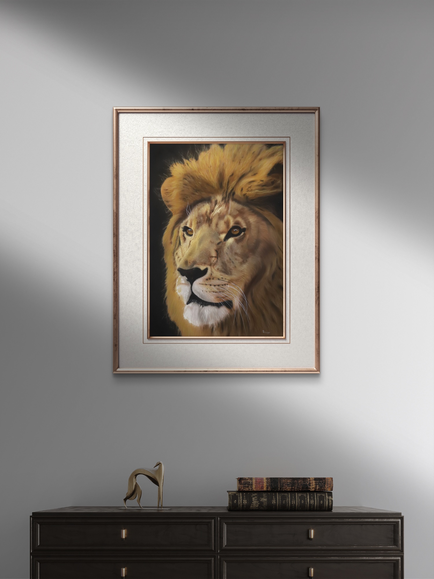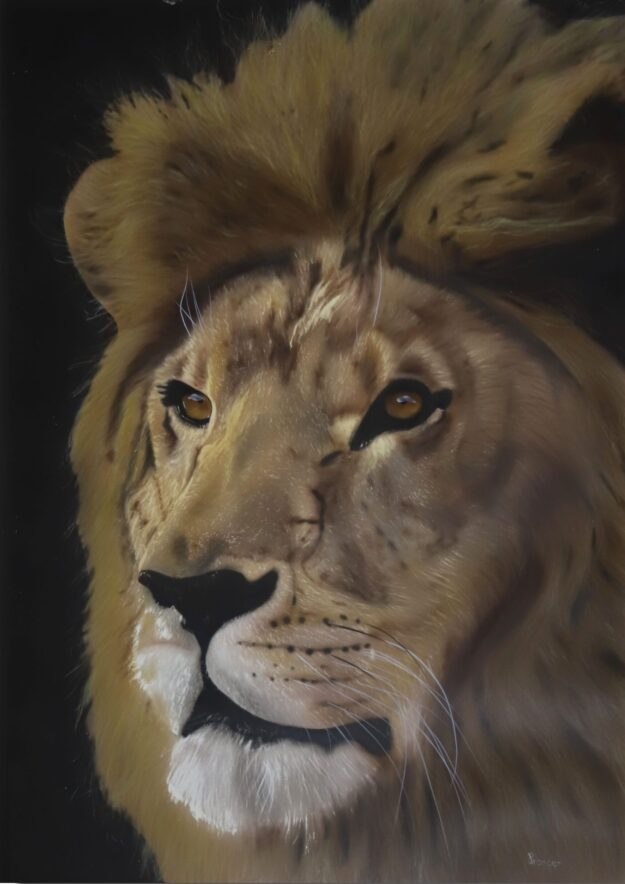 Les traits précis et la finesse de cette majestueuse tête d’un lion, permettent au spectateur de contempler les moindres détails de cette créature royale. Le regard perçant du félin, ses poils épais et sa crinière imposante donnent l’impression qu’il va sortir de la toile à tout moment. On peut presque sentir la force de sa présence, comme s’il avait été capturé au moment où il se préparait à rugir. La couleur dorée qui habille son pelage semble refléter la puissance et le prestige associés à cet animal emblématique. Cette œuvre d’art est un hommage à la beauté et à la force de la nature, incarnées par le roi de la jungle. Le Roi de la Jungle est une invitation à se laisser transporter dans l’univers sauvage et fascinant de la savane, où la vie animale est une véritable leçon de courage et de détermination. Cette aérographie est un véritable chef-d’œuvre qui ne manquera pas de faire vibrer les amateurs d’art et les passionnés de la nature.