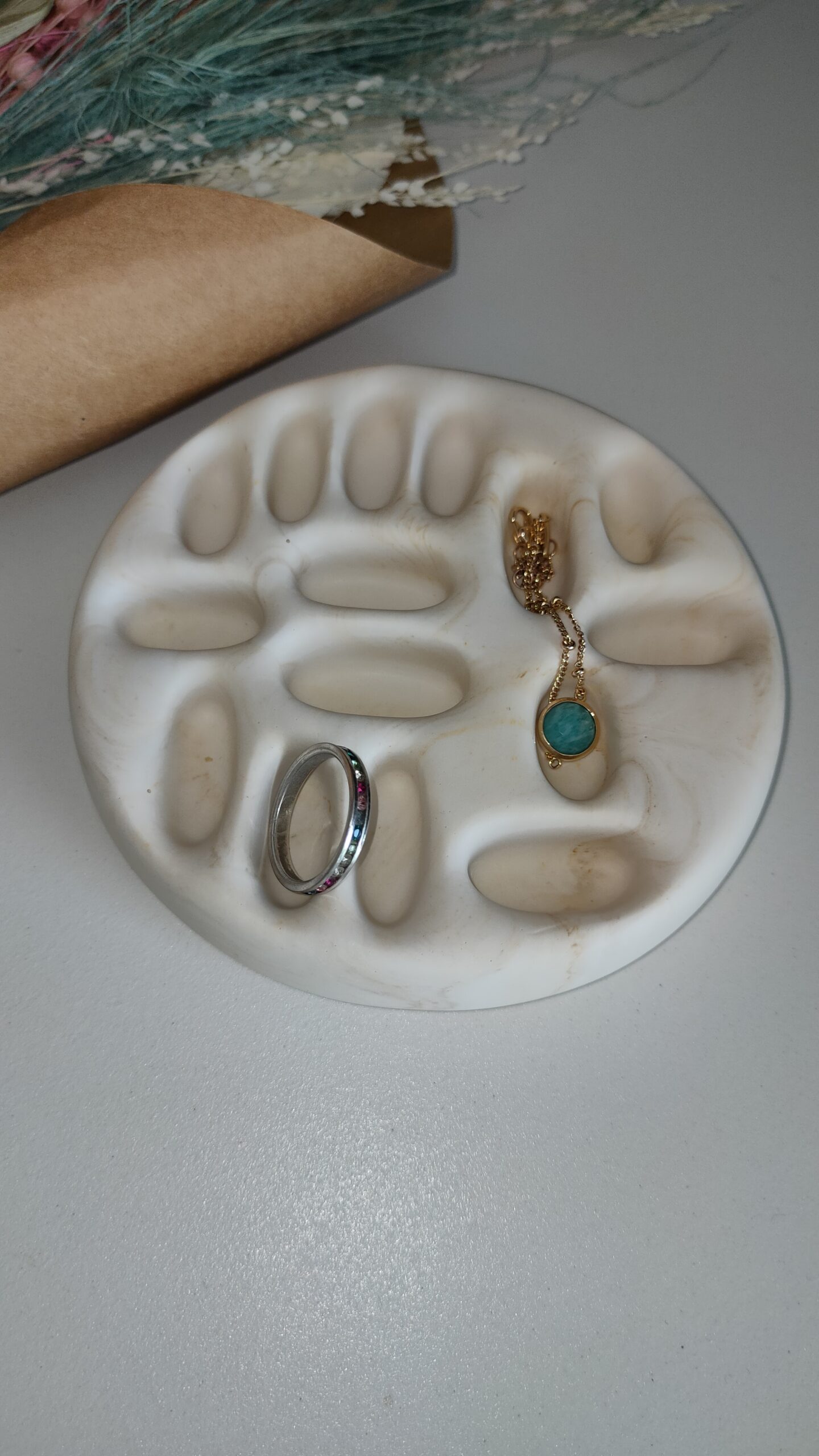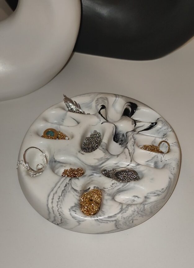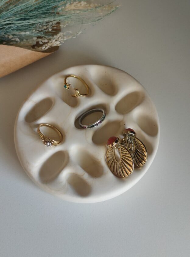 Ce plateau à bijoux en Jesmonite au design original, octroie une place de choix à chacune de vos valeurs. Sa finition arrondie accueille chaque bijou avec élégance.
