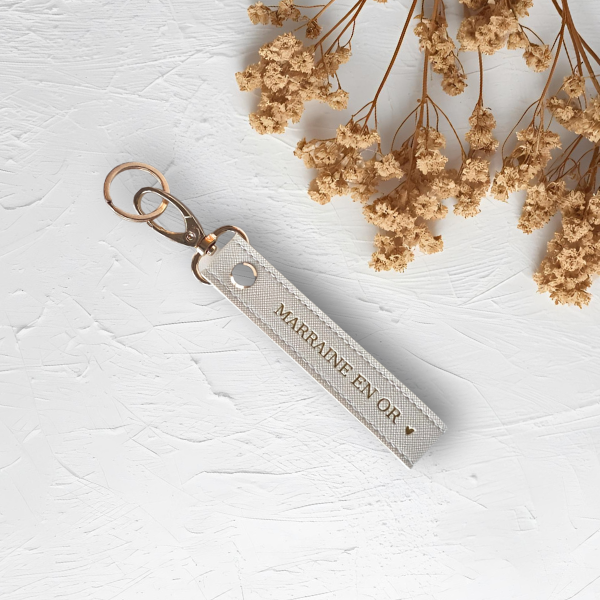 Le porte-clés lanière “Marraine en or” est une petite attention pleine de douceur, pensée pour célébrer une marraine unique et précieuse. Un accessoire imaginé pour offrir un sourire, un souvenir et une dose d’affection à chaque fois qu’elle prend ses clés. ✨