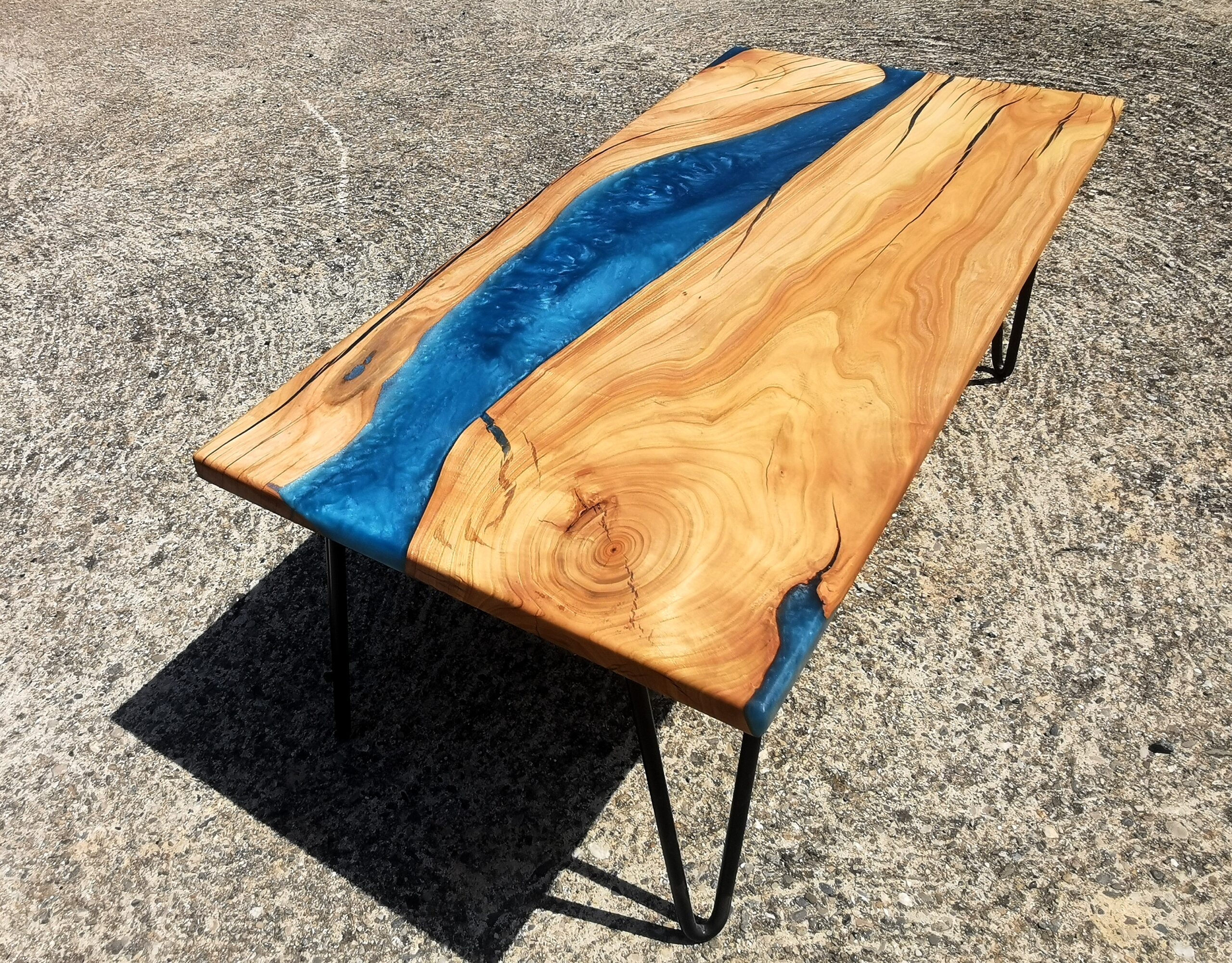 Cerisier Suisse et résine époxy bleue bords de la table en quart de rond et pieds épingle. Huilée à base d’huile de Lin